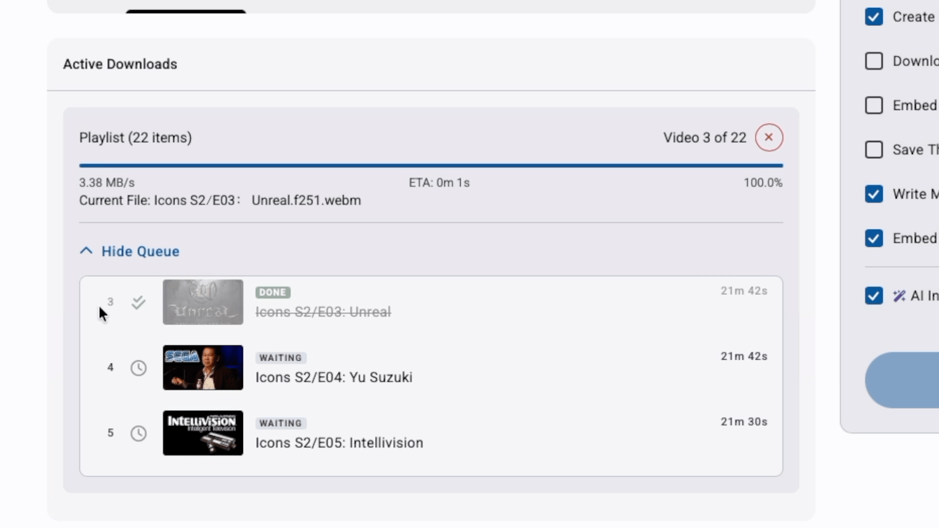 The options panel carries too much. Format, quality, destination, subtitles, transcripts, metadata, thumbnails, AI toggles: it's all there, and that's a lot to parse for a user who just wants to download something. A progressive disclosure approach, where basic settings are visible by default and power-user options live behind an expandable section, would make the first-time experience cleaner without removing anything.