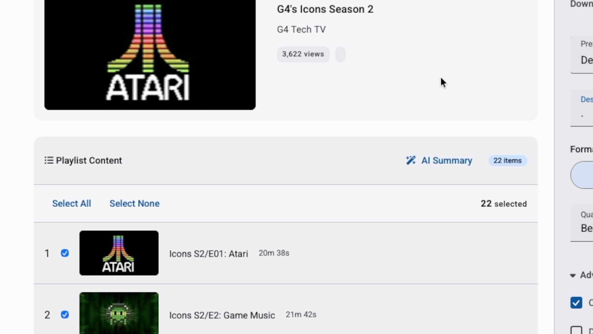 Playlist summarizer. For playlists, an AI Summary button sends up to 100 video titles to Gemini and returns a few sentences on what the playlist covers overall. Useful for evaluating a large playlist before deciding whether to download the whole thing or filter it down.