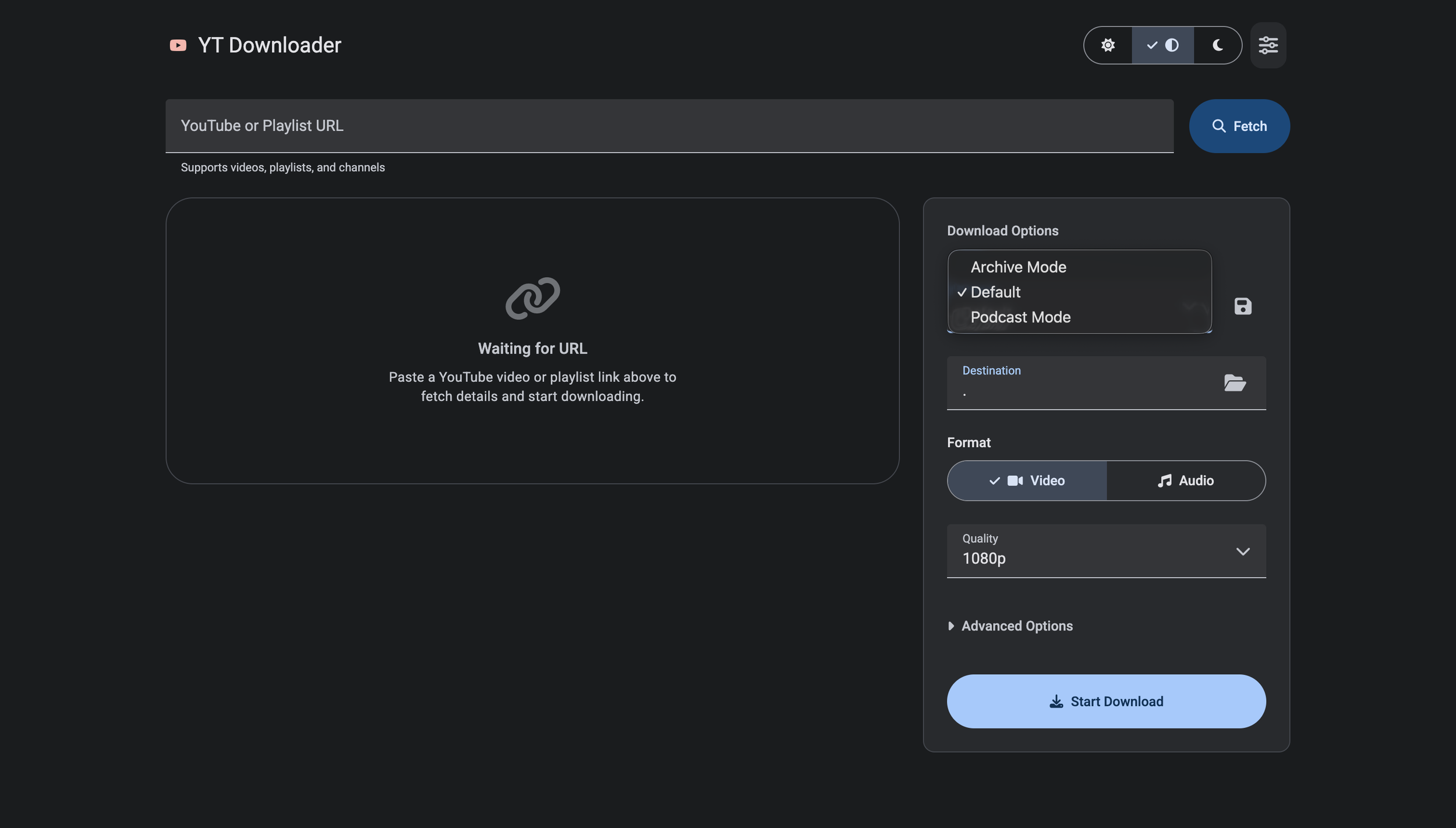 The three built-in presets (Default, Podcast Mode, Archive Mode) each represent a complete configuration: format type, quality, metadata options, subtitle behavior. Selecting one resets all the controls at once. Switch from "downloading a video for reference" to "archiving a podcast with embedded thumbnail and metadata" in a single click instead of touching six separate controls.